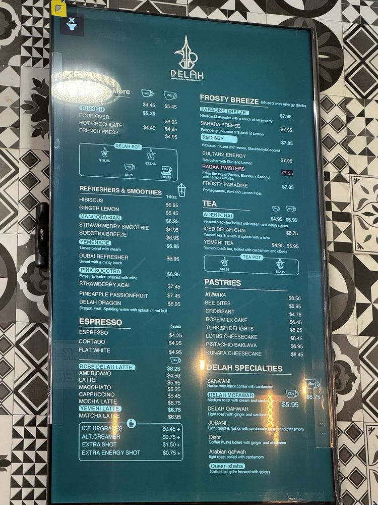 Beyond coffee, Delah’s dessert menu is equally enticing. Popular highlights include Baklava and the innovative Honey Comb Bread stuffed with cheese. Customers rave about the Adeni Chai, boasting a perfect blend of spices and cream, making it a must-try for newcomers. With a trendy and inviting atmosphere, Delah Coffee promises not just great drinks and pastries, but a comforting experience that leaves you craving more.